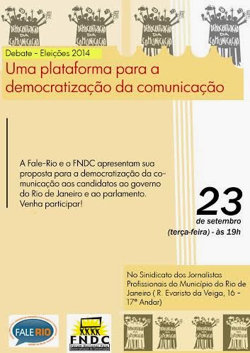 A Frente Ampla pela Liberdade de Expressão no Rio de Janeiro (FALE-RIO) entrega no próximo dia 23 de setembro (terça-feira), às 19 horas, no Sindicato dos Jornalistas, a sua plataforma eleitoral da democratização da mídia no estado do Rio de Janeiro para os candidatos ao governo do estado e ao parlamento.