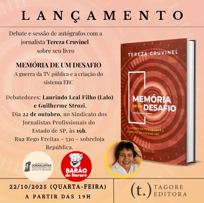 Com apoio do Sindicato dos Jornalistas Profissionais do Estado de São Paulo, do Centro de Estudos de Mídias Alternativas Barão de Itararé e da Biblioteca Milton Belintani, a jornalista Tereza Cruvinel lançará, no dia 22 de outubro, a partir das 19 horas, seu livro “Memória de um Desafio – A guerra da TV pública e a criação do sistema EBC” (Editora Tagore). O evento contará com a participação de Guilherme Strozi e Laurindo Leal Filho, e será transmitido ao vivo pelo YouTube do Sindicato dos Jornalistas. O lançamento ocorrerá na Rua Rego Freitas, 530 – República.