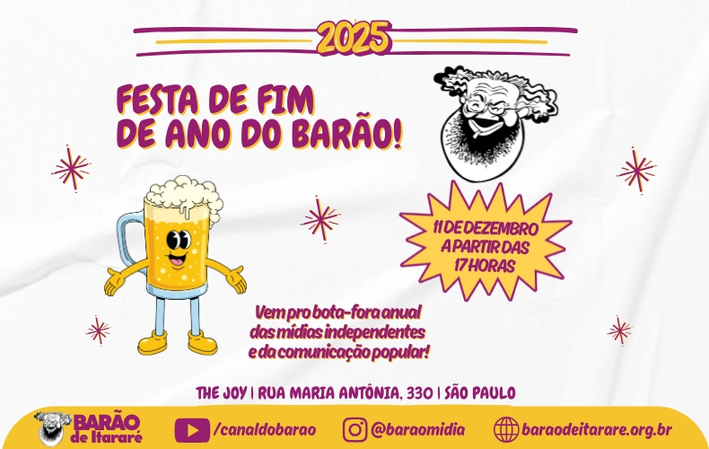 Por isso, o Centro de Estudos da Mídia Alternativa Barão de Itararé convida para a tradicional confraternização com as mídias independentes, que acontecerá na quinta-feira (11/12), a partir das 17h, no The Joy — Rua Maria Antônia, 330.