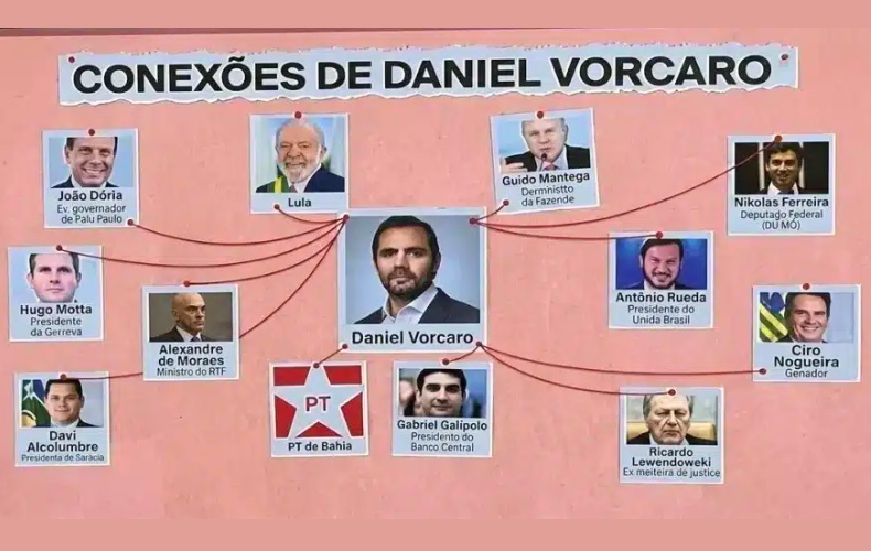 “No meio a foto com cara de rico de Vorcaro, bem debaixo dele a estrela do PT, como se ele fosse um petista, acima deles Lula, como se fosse o chefe de tudo. Numa órbita bem distante do centro estavam Ciro Nogueira, Nikolas Ferreira, Antonio Rueda, João Doria, Hugo Motta, Davi Alcolumbre”, destacou.