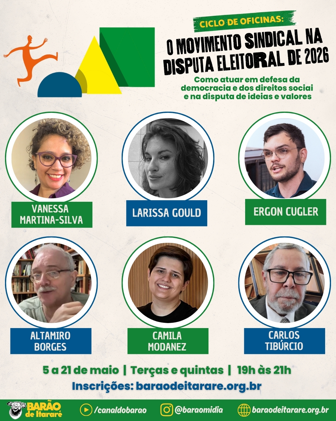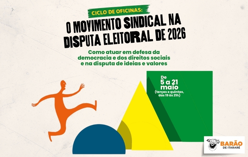 Estão abertas as inscrições para o ciclo de oficinas “O movimento sindical na disputa eleitoral de 2026 – Como atuar em defesa da democracia e dos direitos sociais e na disputa de ideias e valores”, organizado pelo Centro de Estudos da Mídia Alternativa Barão de Itararé. A atividade será realizada entre os dias 5 e 21 de maio, com duas aulas semanais em formato online.