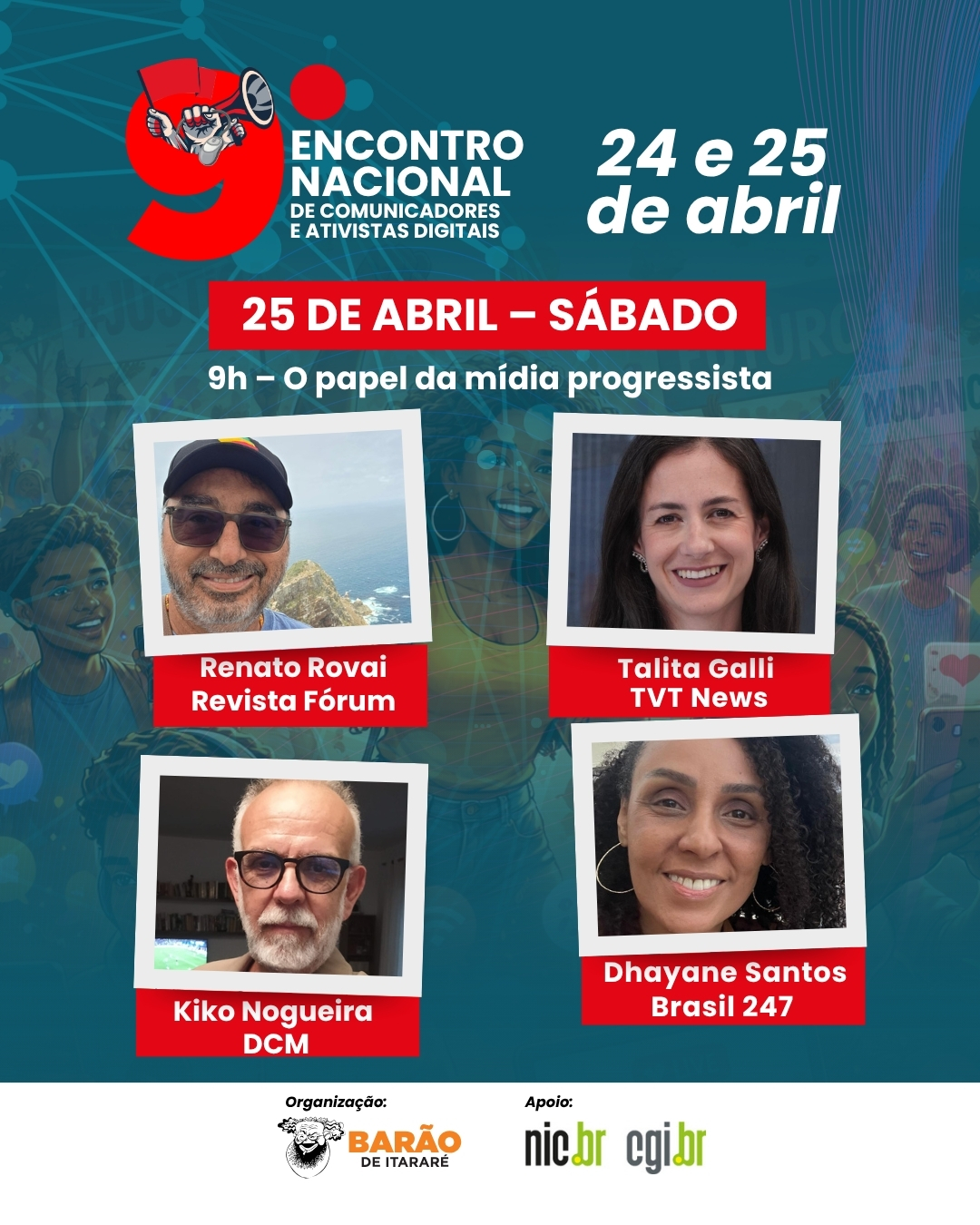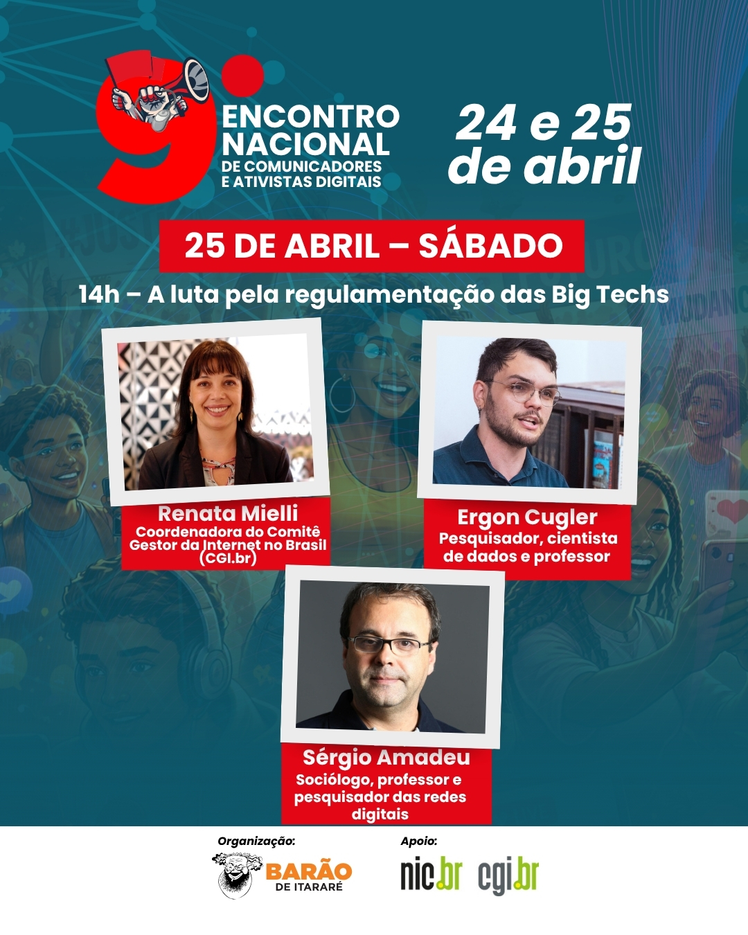 O evento, que conta com apoio do NIC.br, por meio do CGI.br, acontece nos dias 24 e 25 de abril e reunirá no Sindicato dos Jornalistas de São Paulo comunicadores, ativistas digitais, estudantes, juventude, pesquisadores e lideranças políticas de todo o país.