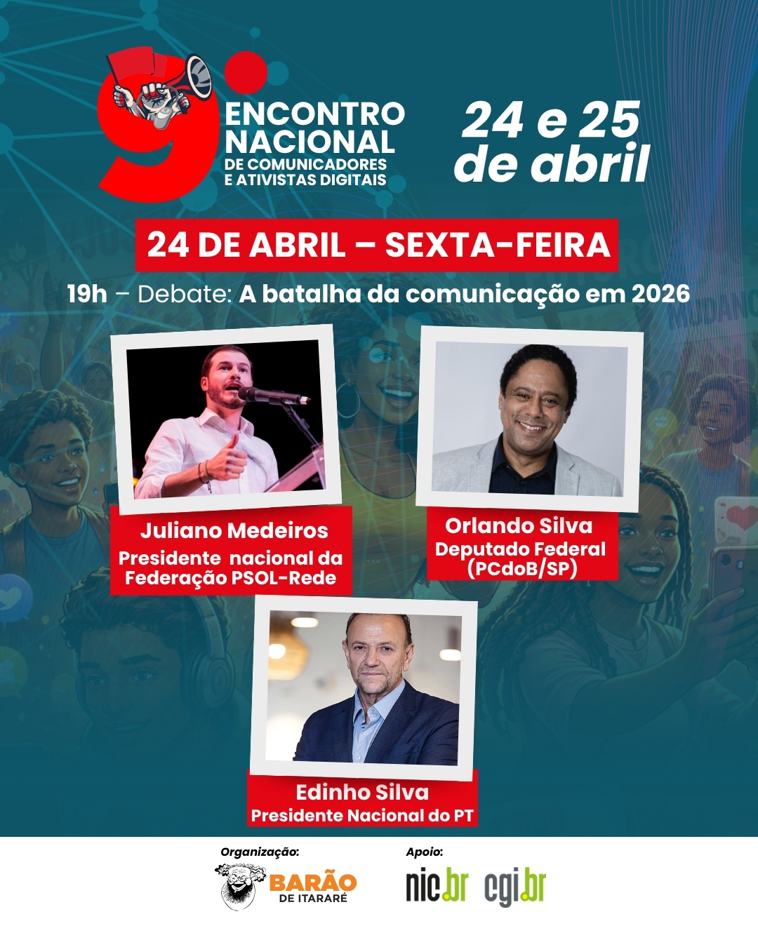 A abertura, na sexta-feira (24), às 19h, traz como tema “A batalha da comunicação em 2026”, com a participação de Juliano Medeiros, Orlando Silva e Edinho Silva. O debate deve abordar os desafios políticos e comunicacionais no cenário eleitoral que se aproxima, além do papel das redes e da disputa de narrativas.