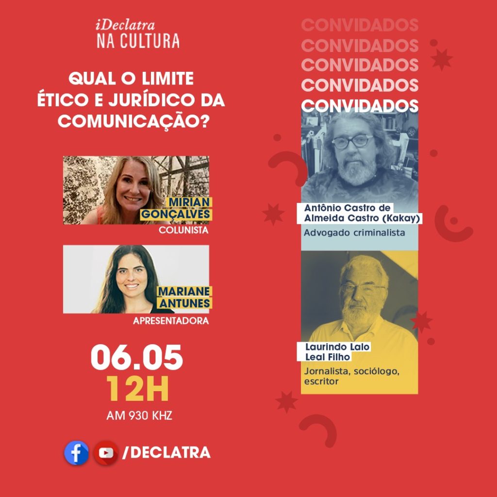Nesta quinta-feira (6), o coordenador do Centro de Estudos da Mídia Alternativa Barão de Itararé, Lalo Leal Filho, e o advogado Antônio Carlos de Almeida Castro, o Kakay, participam de um bate-papo sobre os limites éticos e jurídicos na comunicação. Promovida pelo Instituto Defesa da Classe Trabalhadora (Declatra), a live irá ao ar ao meio […]